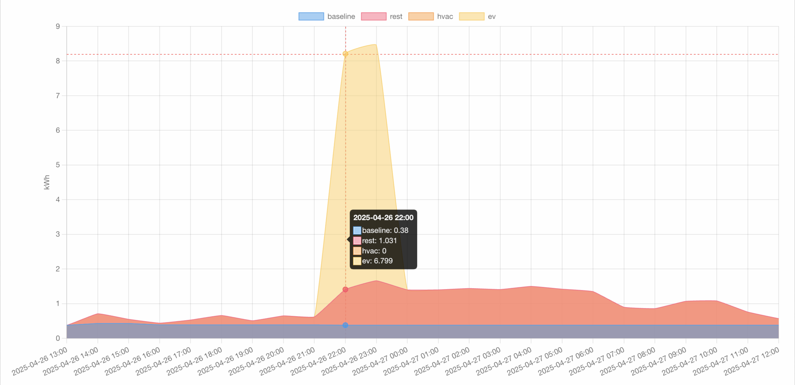 Youtilitics analyzes your usage data directly from your utility. The data is split into baseline (always-on equipment), HVAC, EV charging, and the rest. This chart shows instantly when the EV started charging and when it stopped.